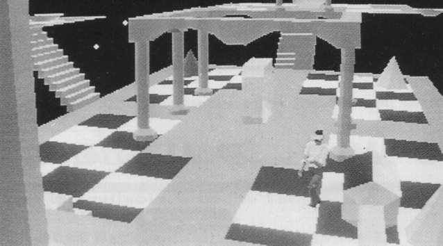 world of chequered platforms and Escher -like pillars and archways.